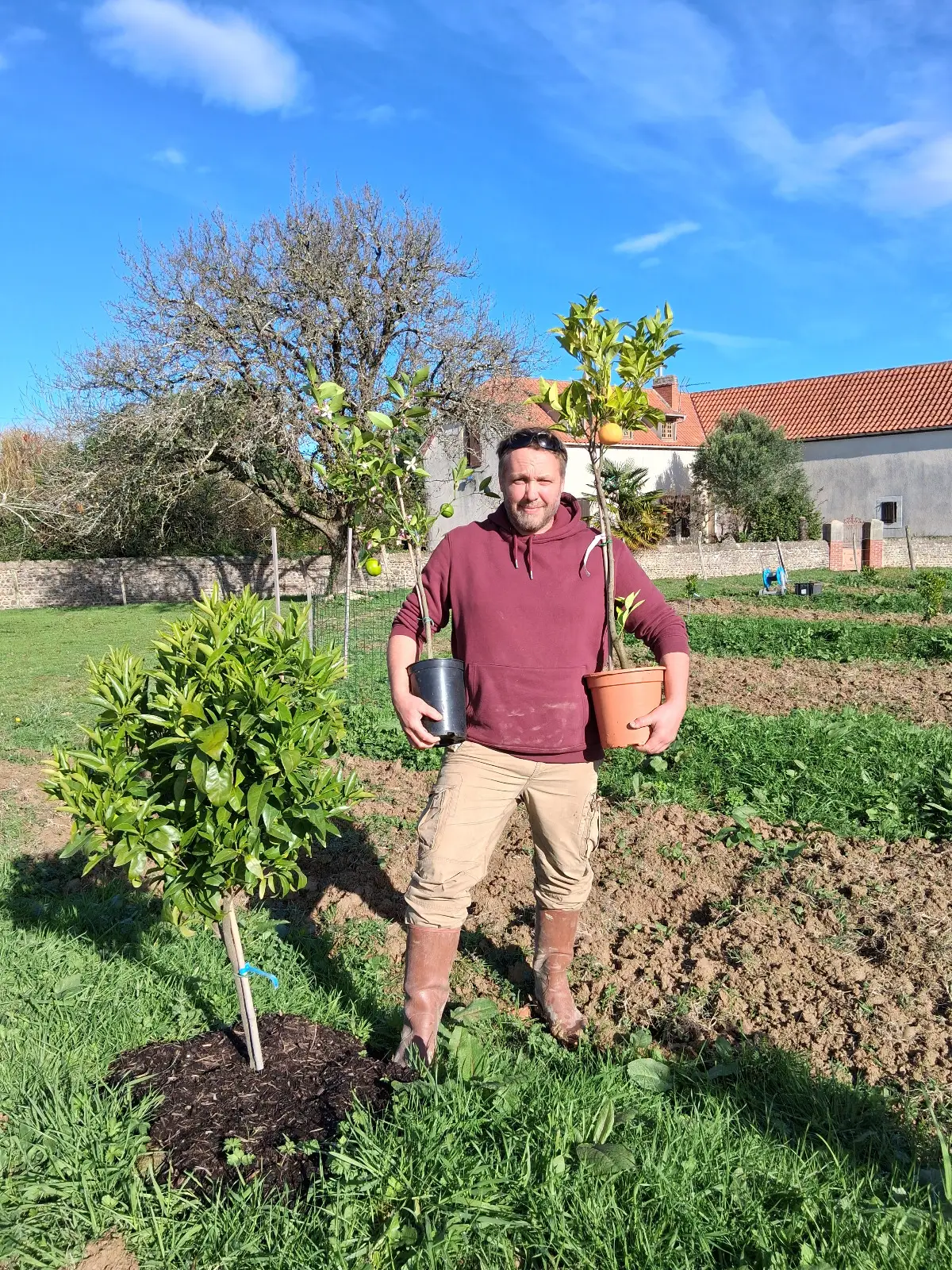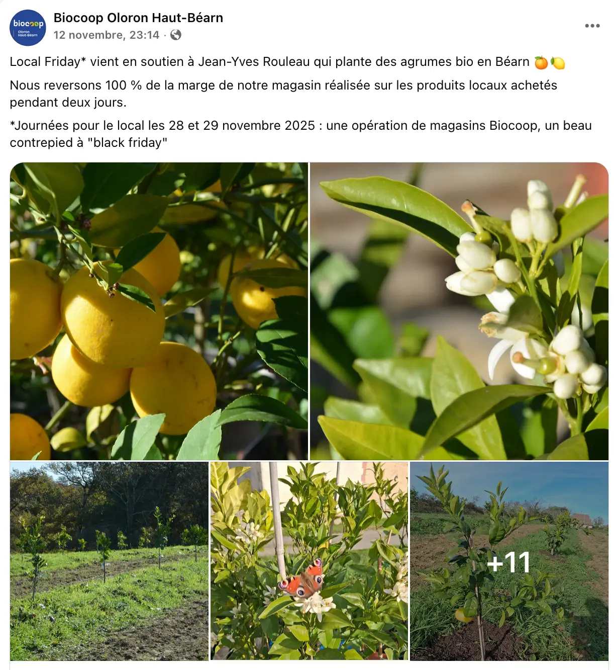 🍊🍋 Les 28 et 29 novembre 2025, par les achats de produits locaux dans nos magasins, nos client.e.s ont soutenu le projet local d'agrumes bio en Béarn porté par Jean-Yves Rouleau paysan à Mialos (64)** rejoint dans l'aventure par sa compagne Charlène. Il va pouvoir planter près de 3 000 pieds d'orangers, citronniers, clémentiniers sur ses terres pour fournir d'ici deux ans des agrumes bio et locales.